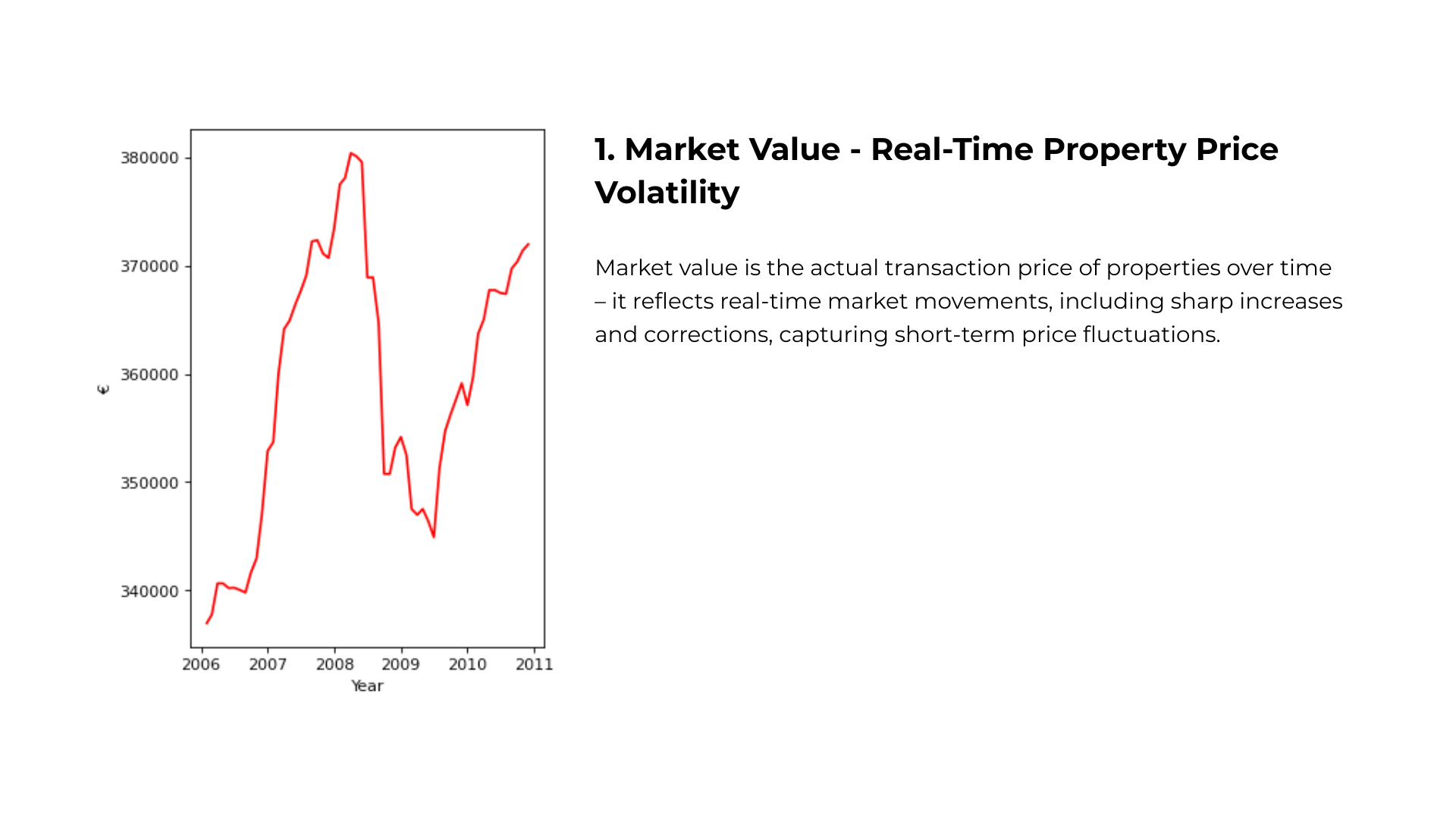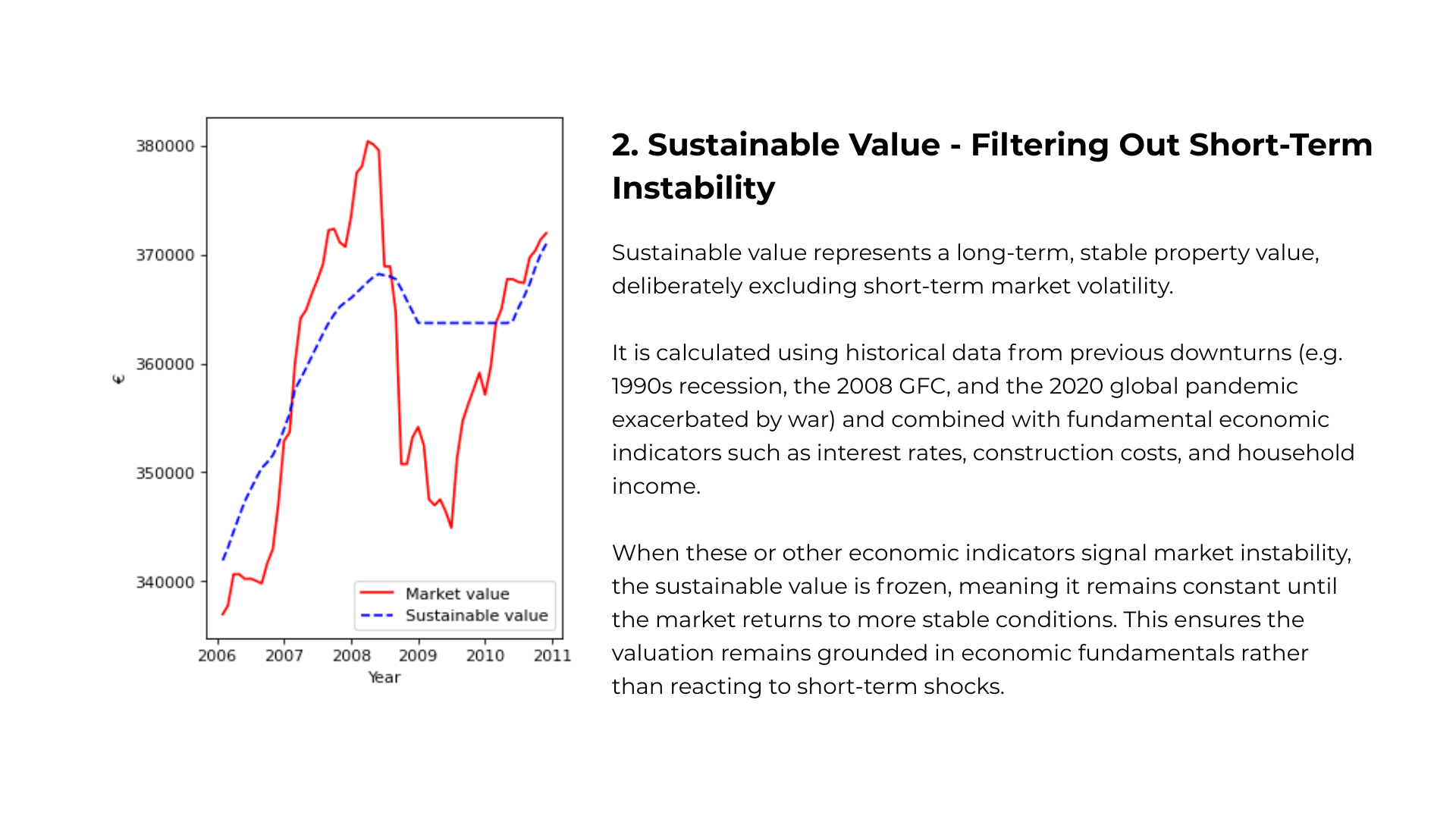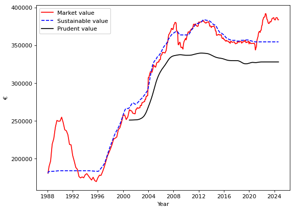 Figure 2: The graph illustrates market value, sustainable value, and prudent value over time using past and present data.