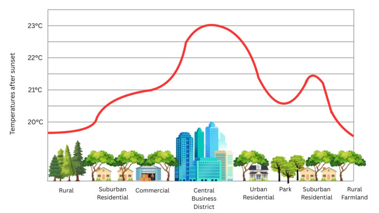 Figure 1: The urban heat island effect occurs when dense built-up areas with concrete, asphalt, and limited greenery absorb and trap heat, making cities noticeably warmer than their surrounding rural areas. (Source)